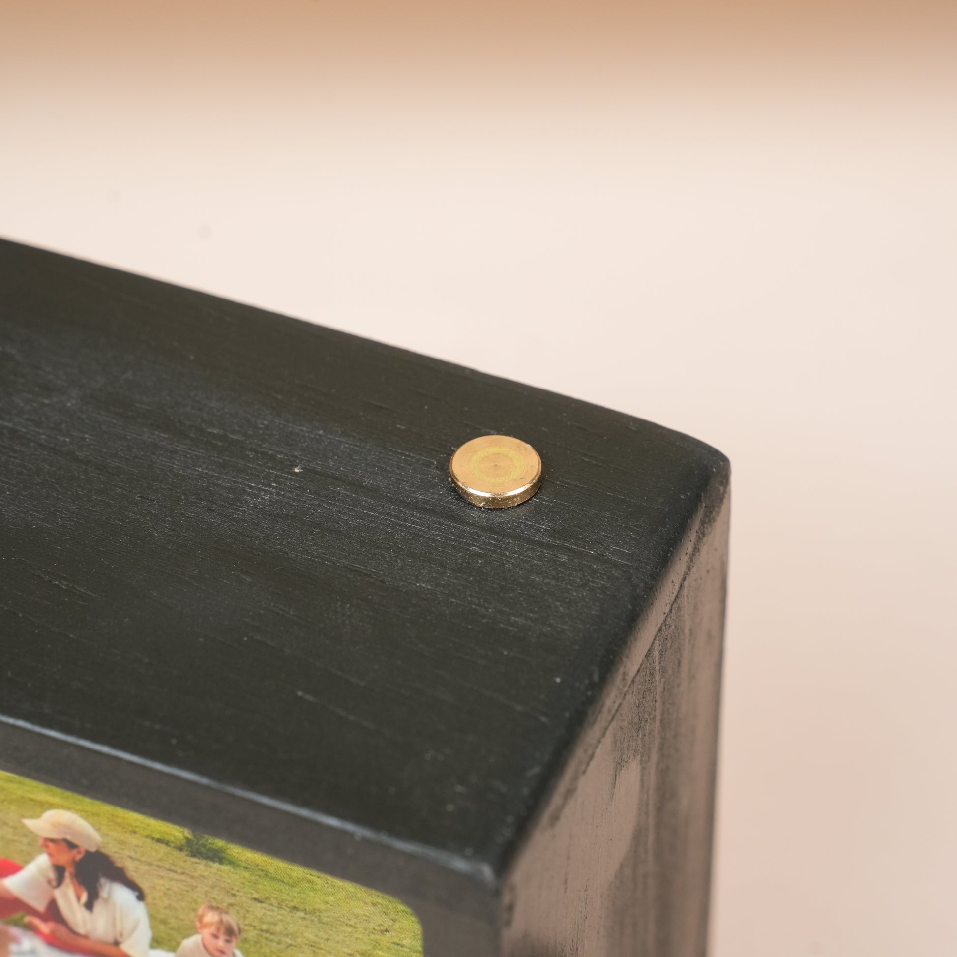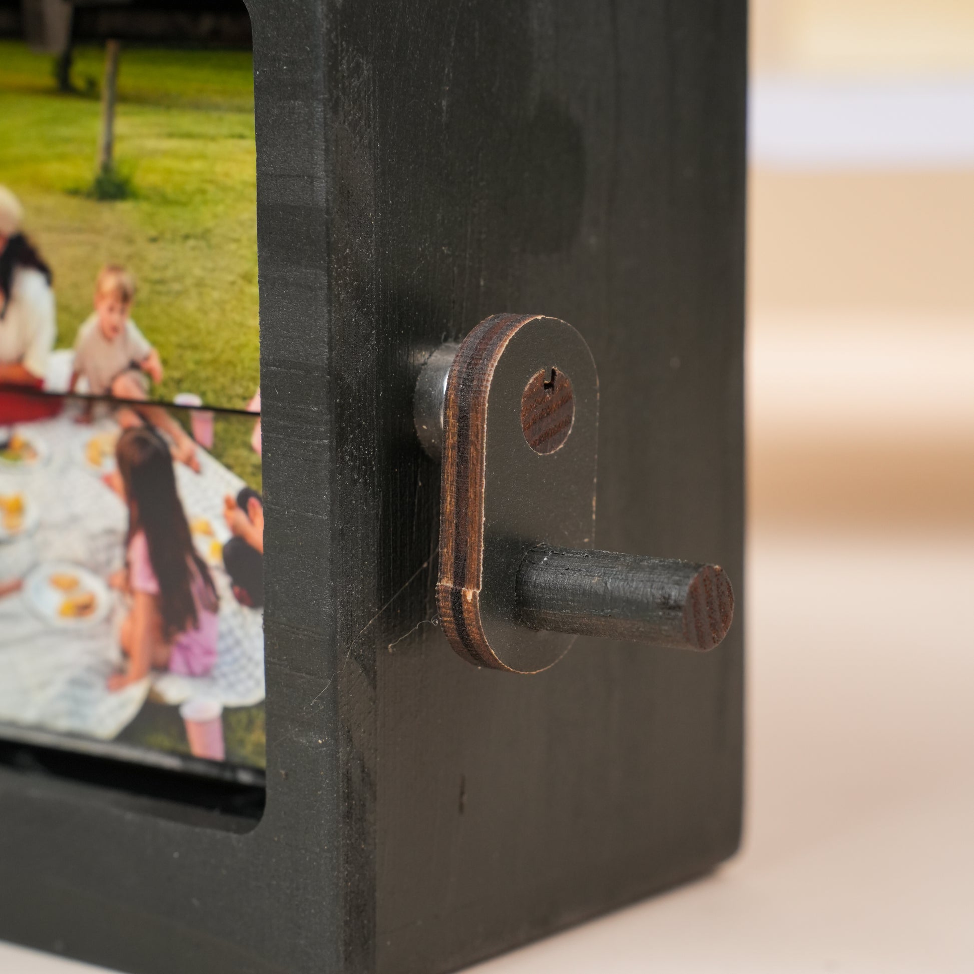 Designed with a manual crank mechanism, each turn brings your memories to life - one frame at a time. The built-in light enhances the display, turning it into a warm, thoughtful piece of home décor.