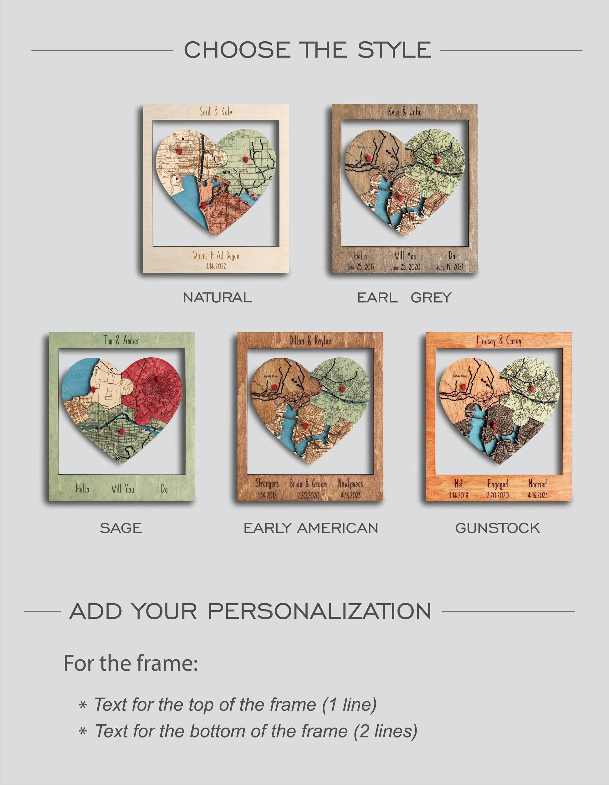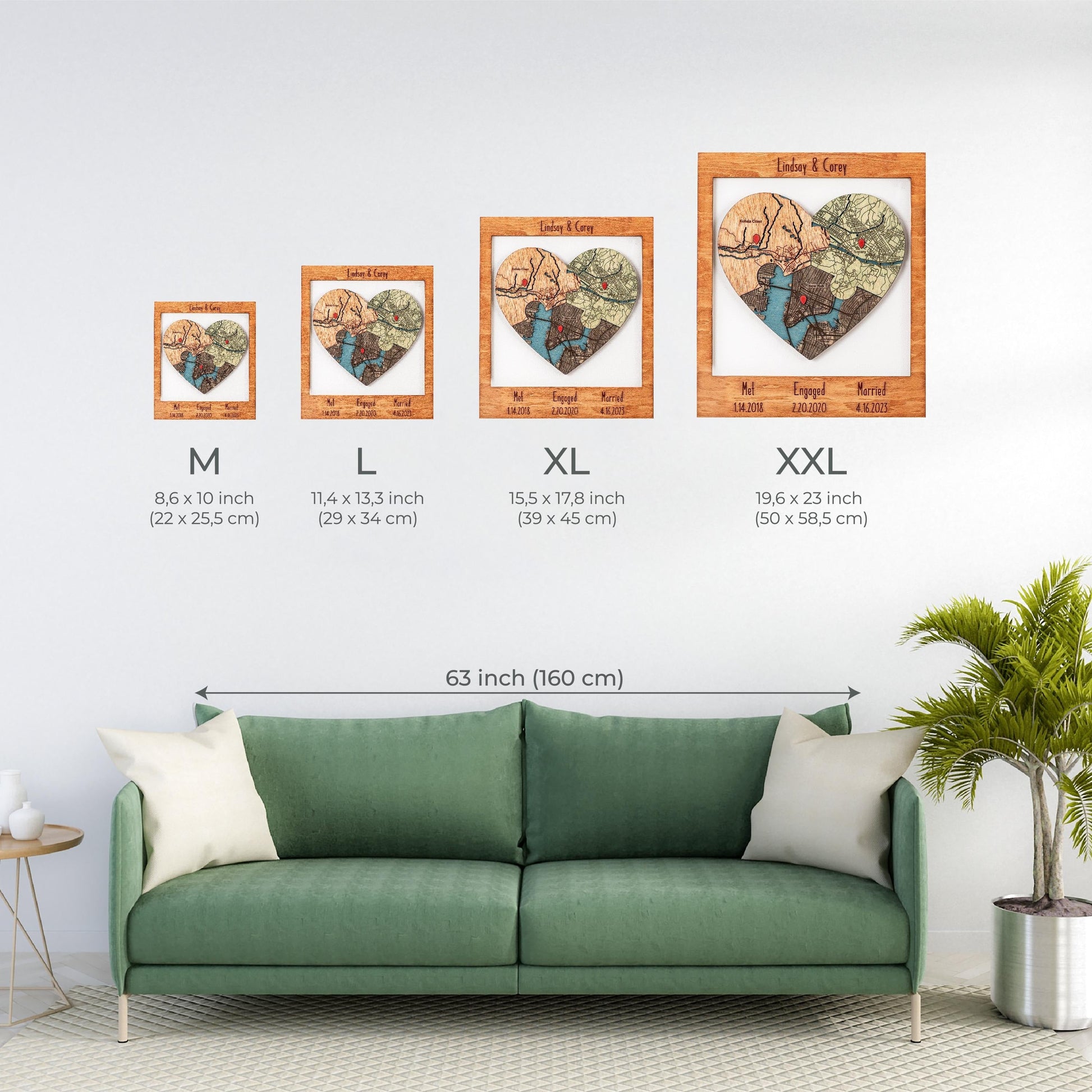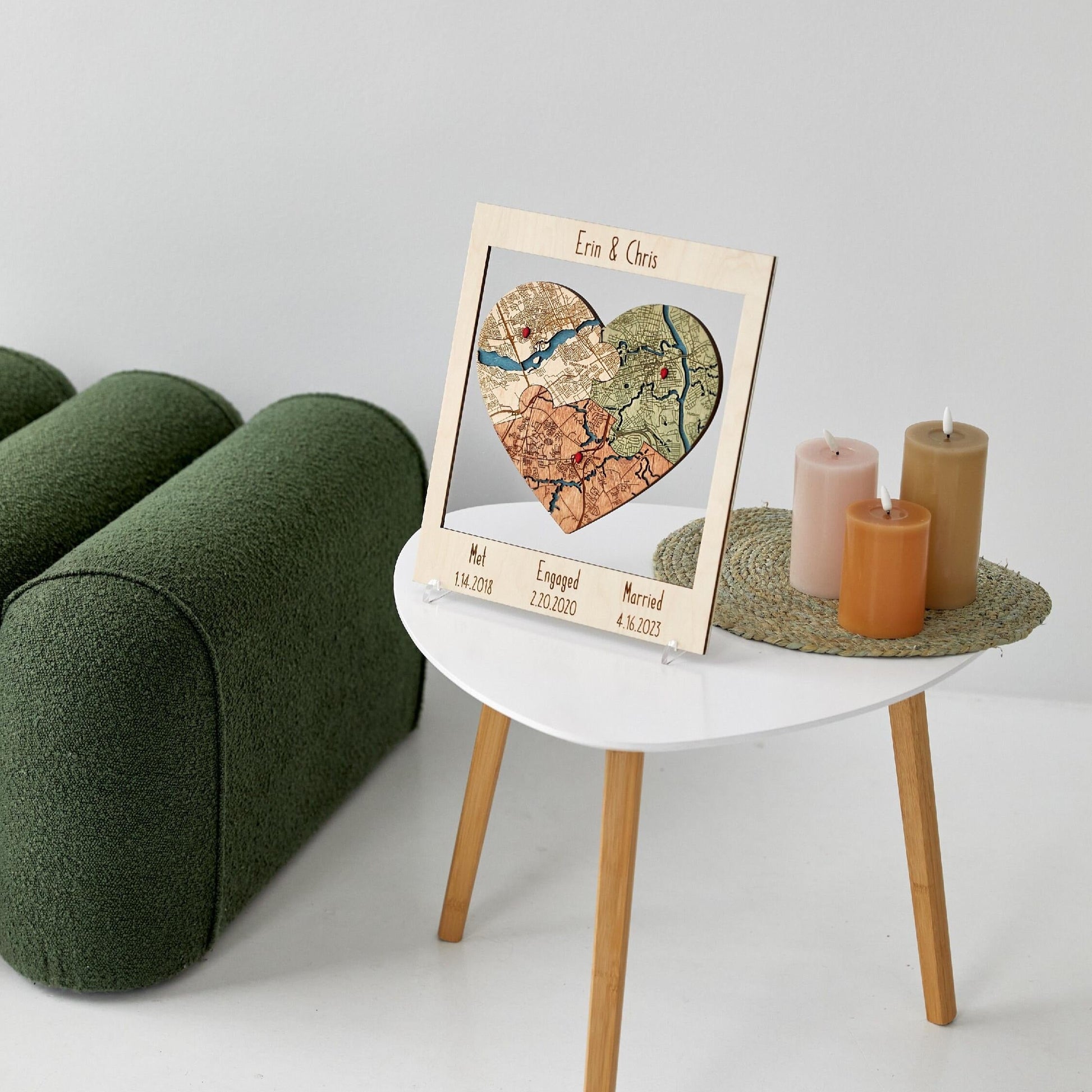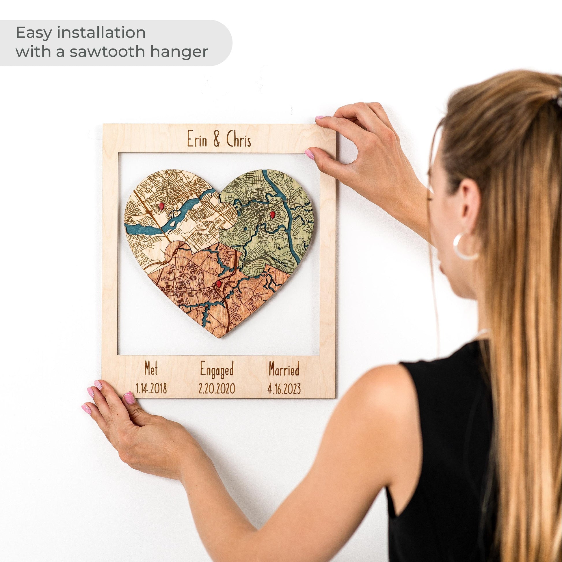 Met Engaged Married Wooden Map, Three Locations Heart Puzzle Map, Framed Wall Decor Gift, Personalized Wedding Anniversary Gift for Couple