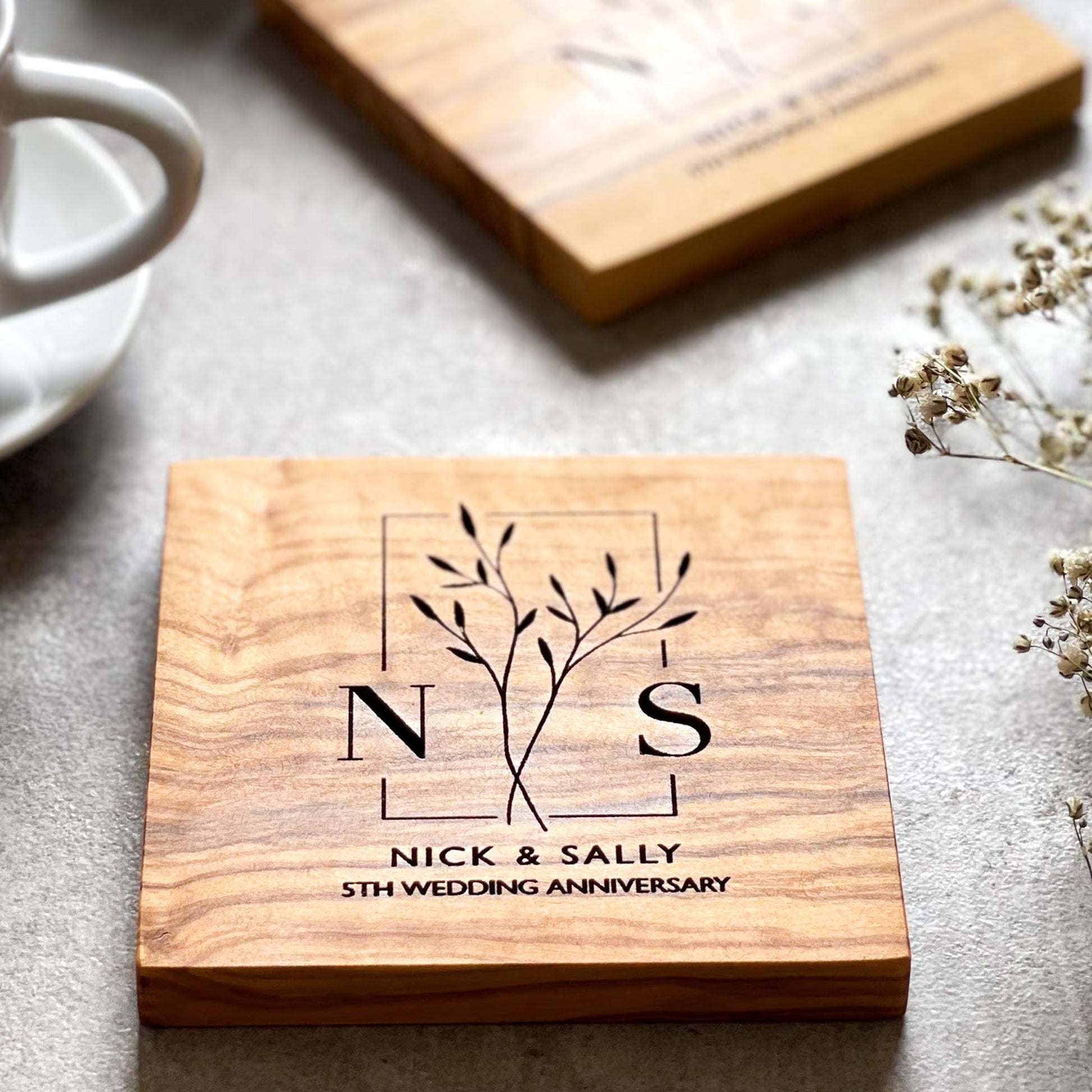 Pair of Personalised Marble & Wood Coasters and Gift Box | Personalized Wedding, Engagement, New Home or 5th Anniversary Gift
