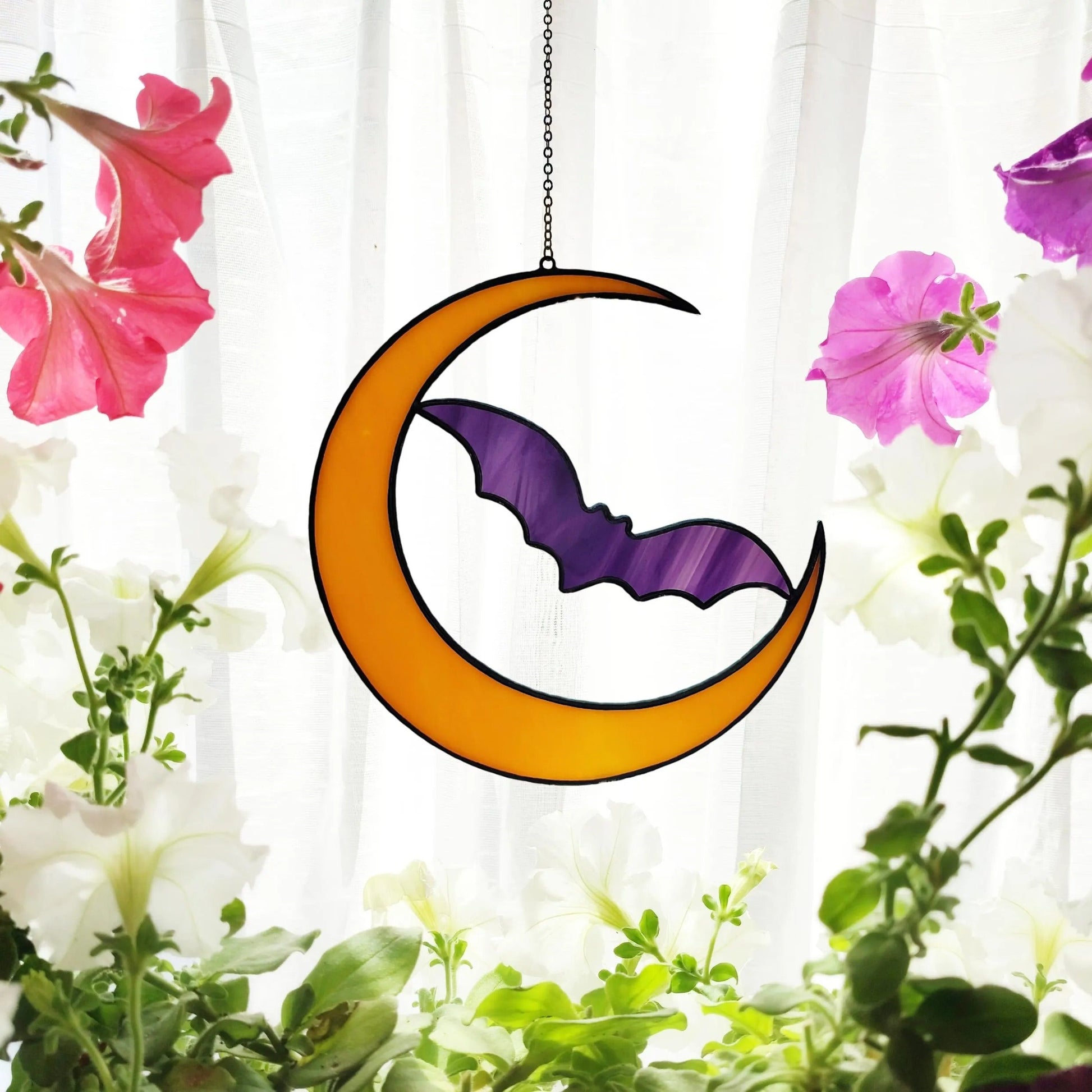 Stained Glass Bat and Moon Suncatcher. Perfect Halloween Decor for Spooky Season. Add Gothic Charm to Your Home or Garden Display.
