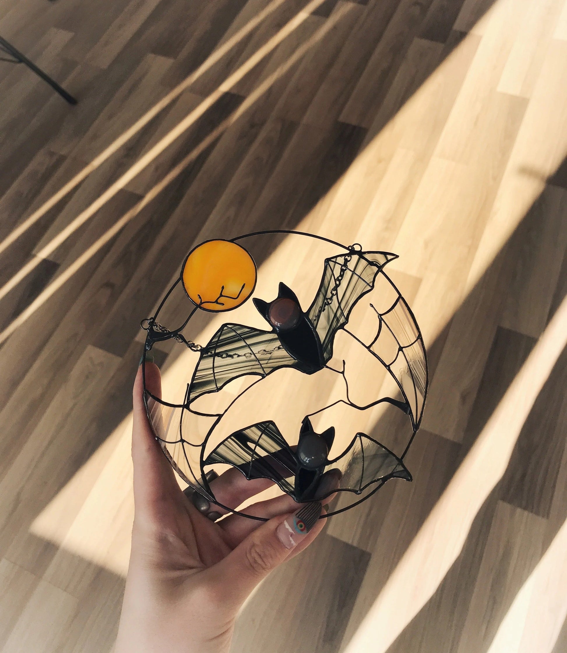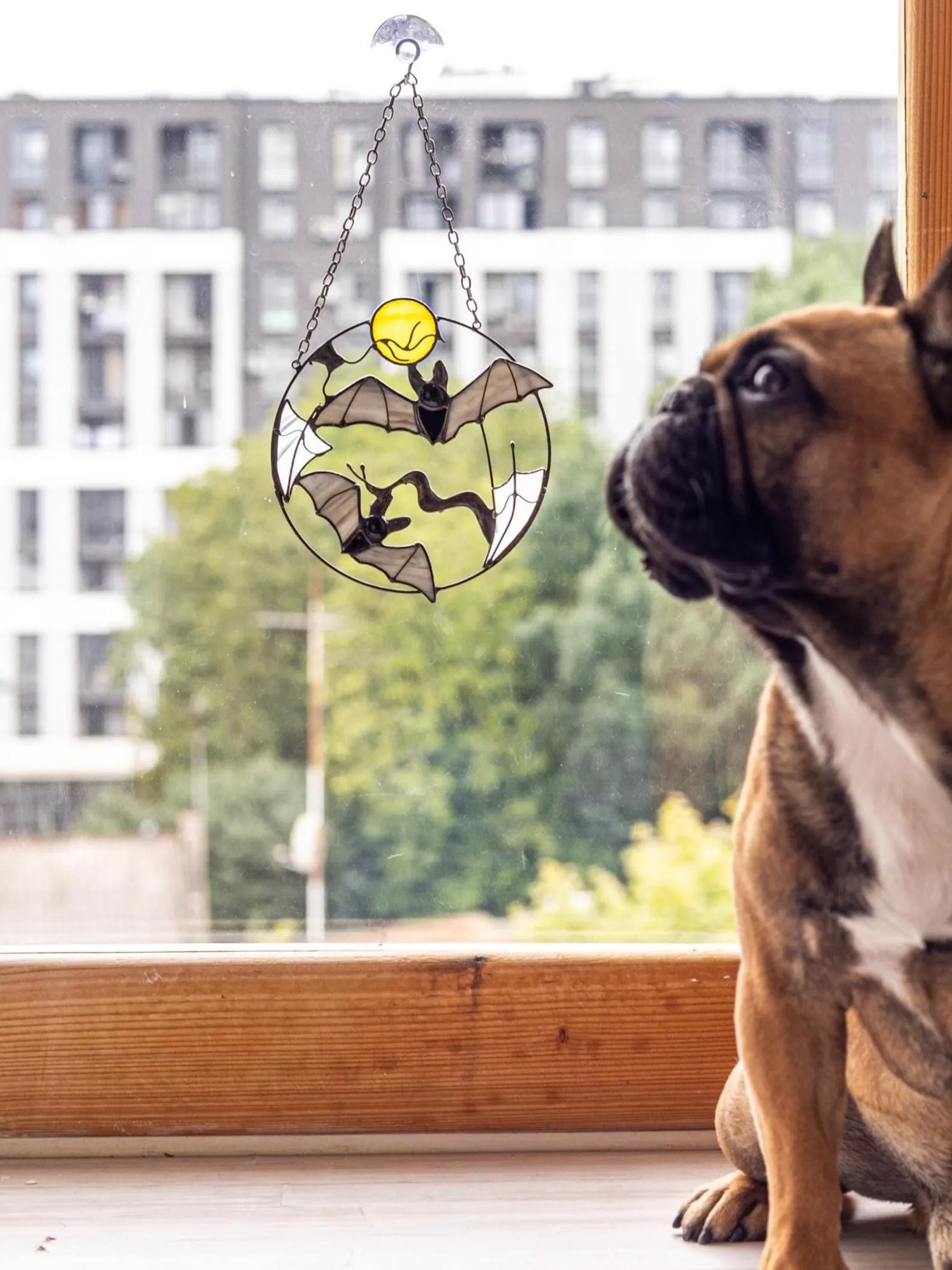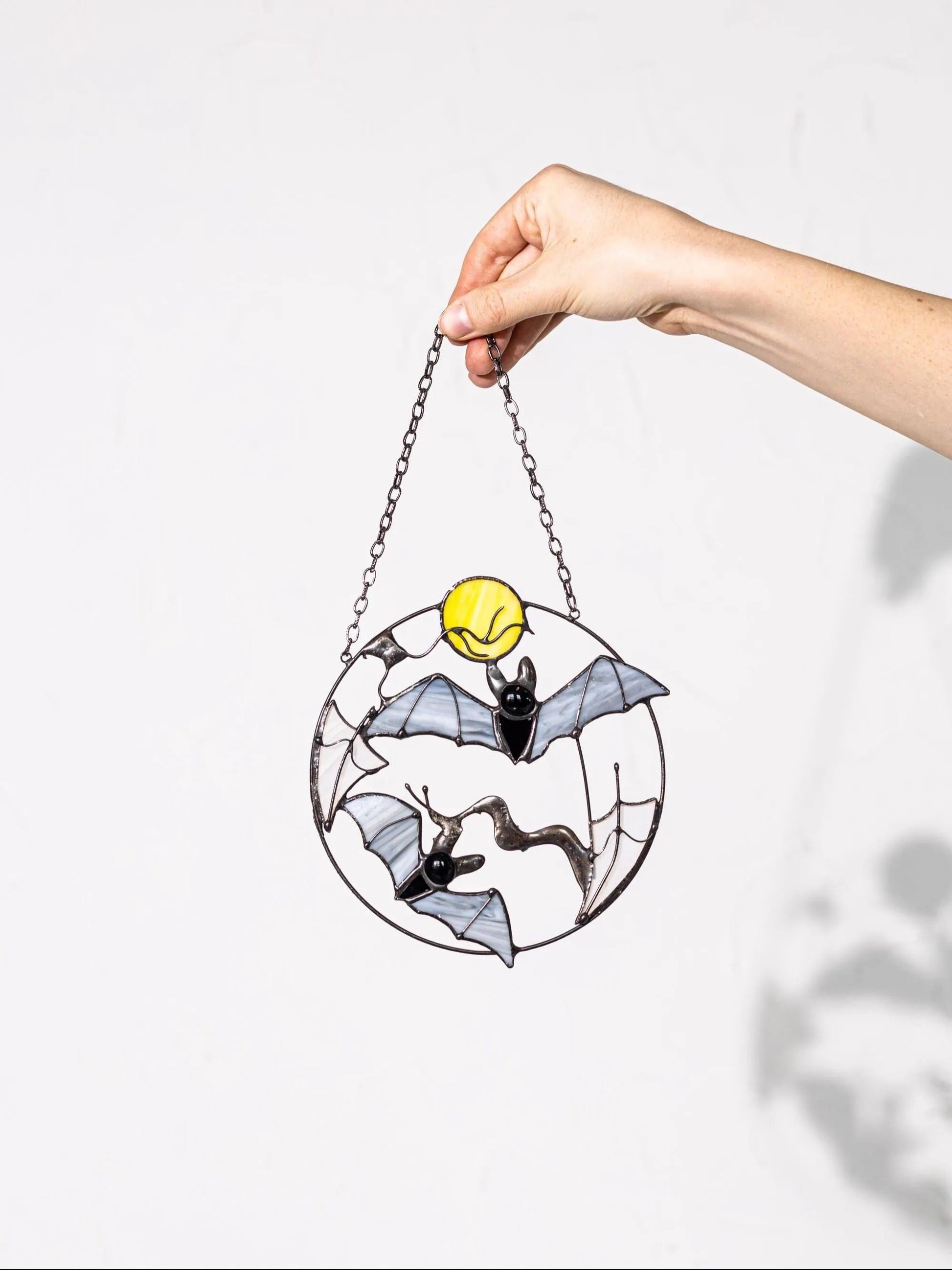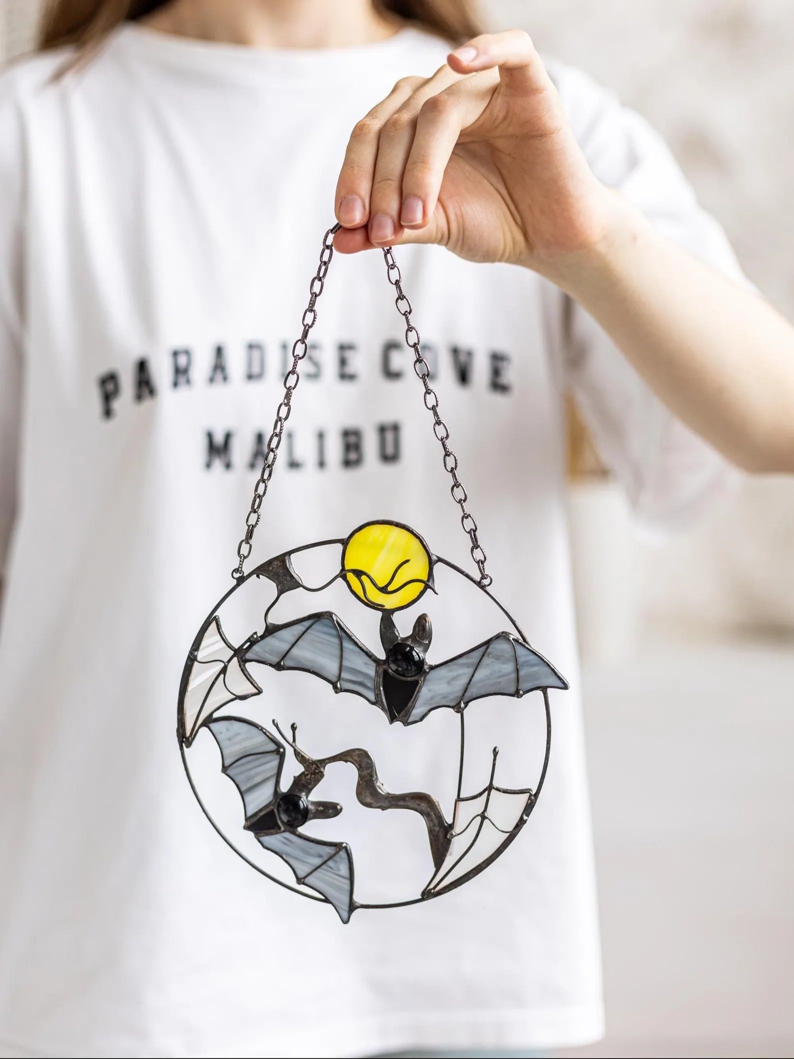 Stained Glass Bat Suncatcher – Halloween Window Hanging Decor, Gothic Moon, Spooky Gift, Flying Bats Wall Art