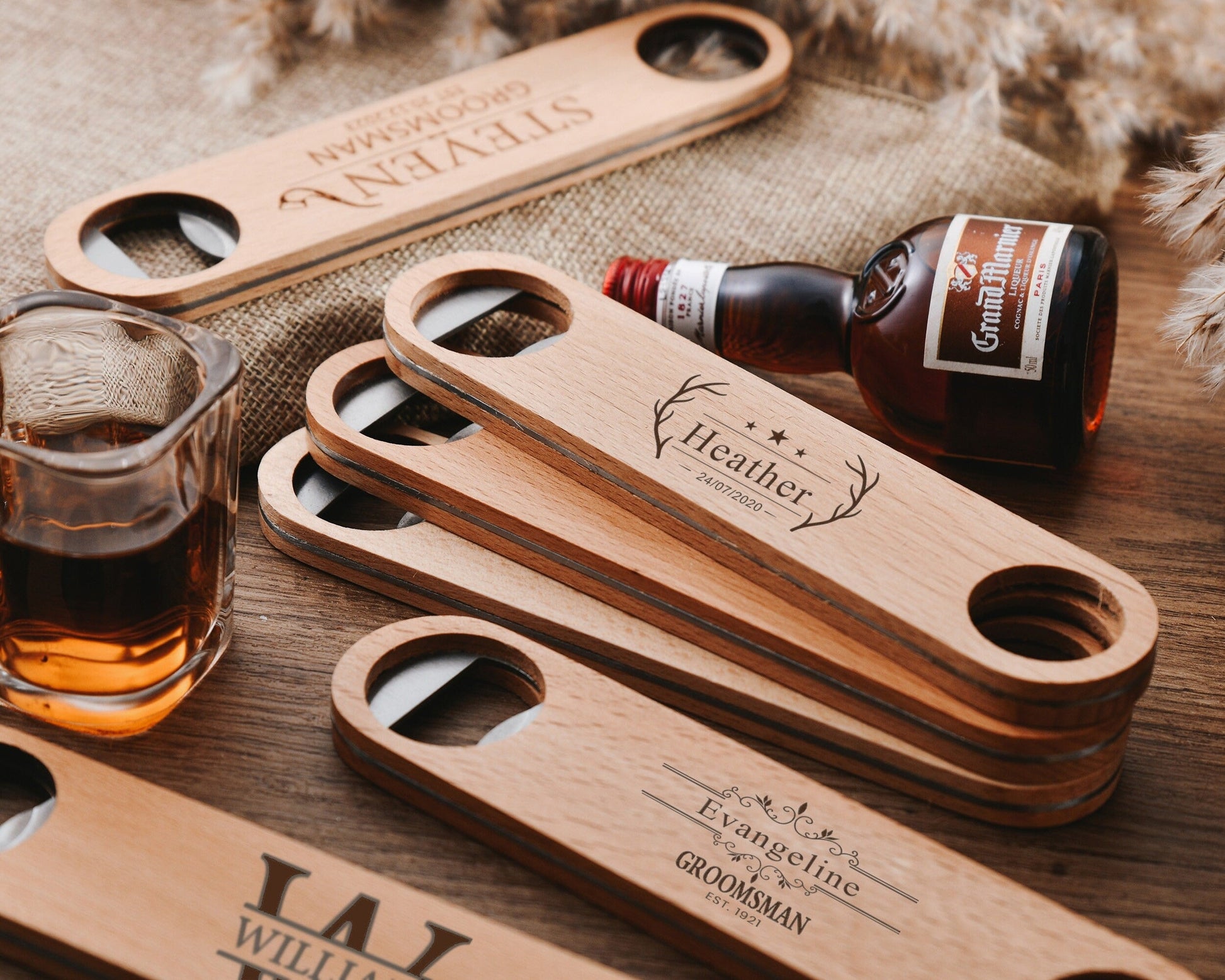 Unique Engraved Flat Bar Style Speed Bottle Opener, Groomsmen Proposal, Customizable Wooden Bottle Opener